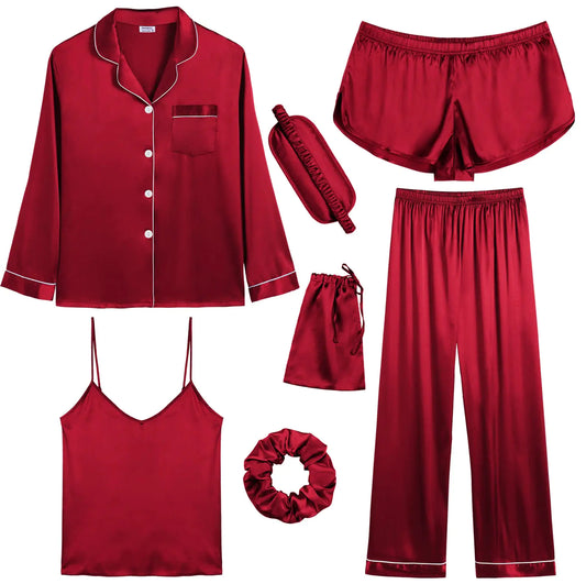Women Satin Pajamas 4pcs Pajama Cami Shorts Set and Button Down Long Sleeve Pjs Loungewear Sleepwear Dark RedLarge